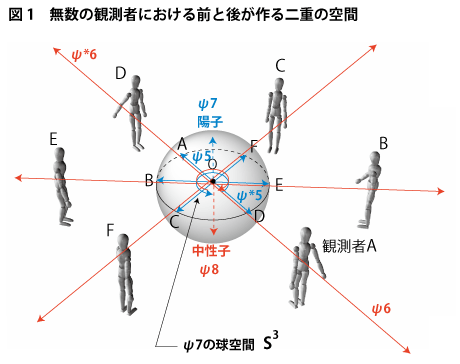 キアスムの関係をそのまま図示しているのでちょっと分りにくいかもしれませんが、言わんとせんとするところは極めて単純明解なことが分るでしょう。例えば、観測者Aにおける絶対的「前」は青い矢印で示したψ5のスピノールの部分に集約されて入り込んできています。すると、自動的にその絶対的「後」は原点Oを挟んでψ5の反対方向となる赤い矢印で描いたψ6の矢印に対応してくることになります。結果、ψ7とψ8はこのψ5とψ6の関係を形作る2本の矢印を、モノ(点でもよい)の周囲を取り込んだ無数の観測者の位置に交差させるように回転させていけばいい訳ですから、図2に示したような様子になります。陽子のアイソスピンはψ5-ψ*5の等化回転を一本のスピノールに集約させ、同様に中性子のアイソスピンはψ6-ψ*6を同一化させる回転を一本のスピノールに集約させています。結果的に、このアイソスピンの軸を3軸回転(SU(2)になります)させれば、相互反転した二つの3次元球面が形作られることになります。このときの二つの球空間が次元観察子ψ7とψ8の球空間に対応します。ψ7が客観的な点概念、ψ8が客観的な時空概念という意味が容易に理解できるのではないかと思います。