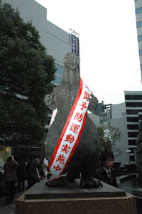 ところが、今月訪れてみると、このゴジラ像いつもと様子が違う。ん?何じゃありゃ。。誰かのイタズラか?と思って近づいてみると、な、なんと、丸の内消防署の火災予防運動の一環ということで、デカデカと「火災予防運動実施中」というタスキがかけられている。ありゃりゃのりゃ。ゴジラが火災予防運動の音頭取り?勘弁してくれ、消防庁さんよ。わたしの世代の子供心に残っているゴジラの崇高なイメージを汚さんでくれよ。ゴジラの原点はガメラとは違うんじゃ。人間の都合などこれっぽっちも考えていない破壊の帝王なんじゃぞ。海の中に潜み、どこからともなく神出鬼没に現れては、都市という都市を片っ端からぶっ壊して行く。それがゴジラたい。だいたい、デビュー作でこの銀座を火の海にしたのがこのゴジラじゃないか。それが何で火災予防運動のタスキをかけて有楽町に再び現れんといかんのじゃい!!