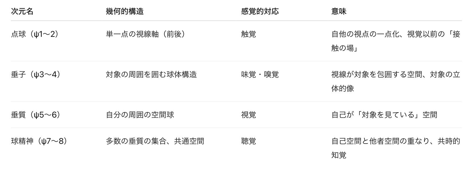 3. 視線の幾何学と元止揚空間の出現 こうした内的持続空間の中で、空間は四重に重なった回転層(層状の空間構文)として意識され始める。細かい説明は省いて、ここではその四つの回転層を一覧しておく。これらの空間は、表にあるように、五感の深層構造としても捉えることができる。