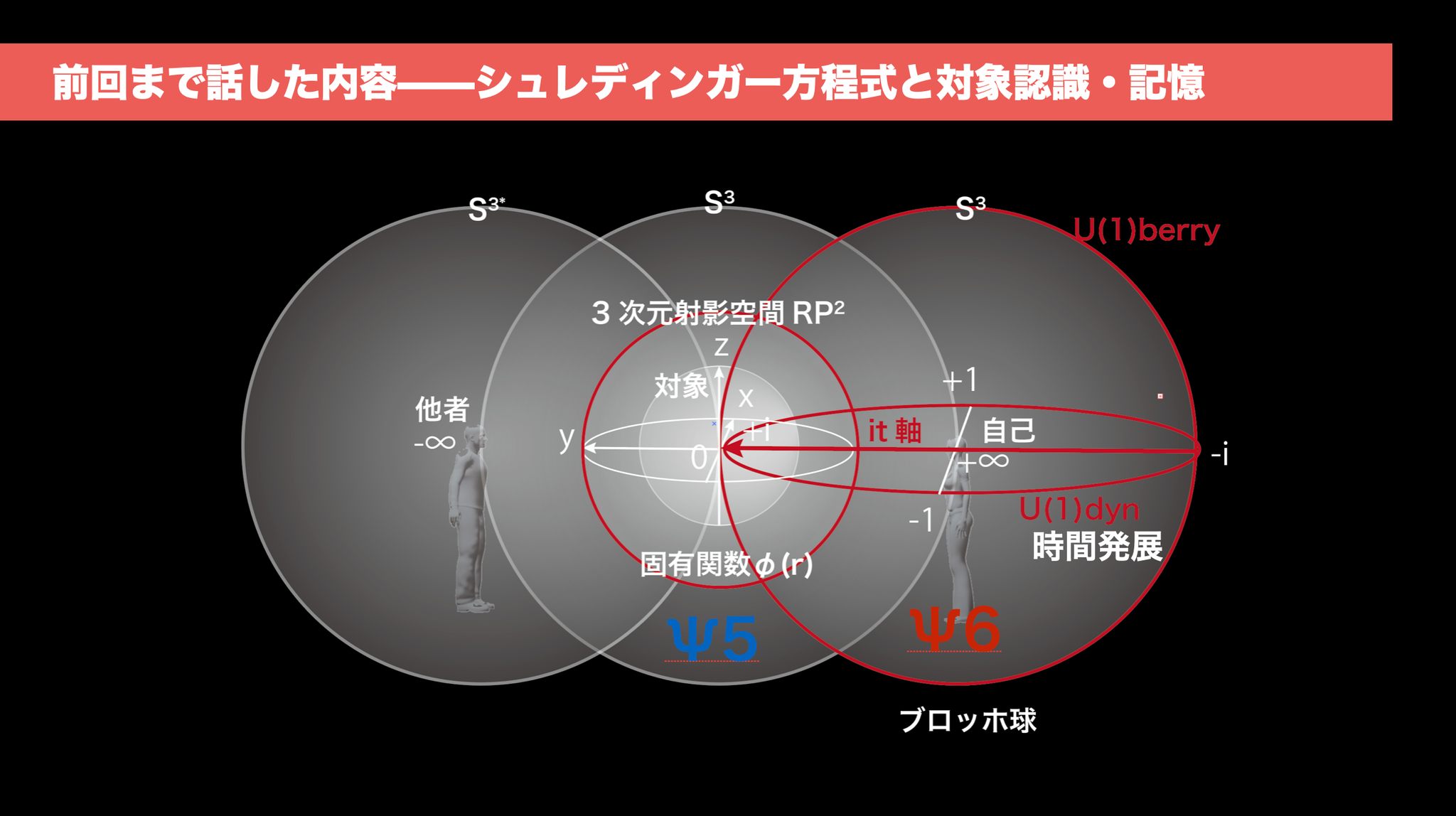 ψ6の赤道円は、量子力学における時間発展演算子(e^{-iEt})に対応していて、ここでは「ψがどう変化していくか」が追跡されている。つまり、記憶の運動の方が重視されている感じです。